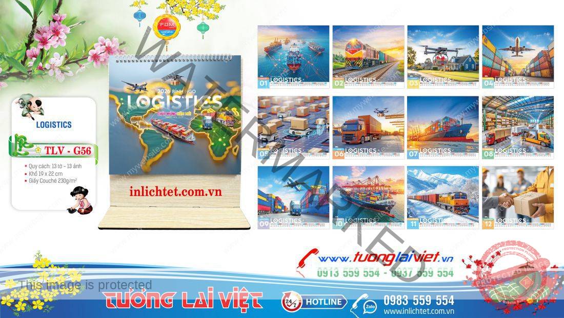 Lịch gỗ để bàn Logistics là món quà Tết hoàn hảo dành tặng đối tác, khách hàng, đồng nghiệp và người thân nhân dịp năm mới. In lịch để bàn khung gỗ được In Lịch Tết Tương Lai Việt thiết kế phong phú về chủ đề với những hình ảnh về Phong cảnh, Du lịch, Bon sai, Chữ thư pháp, Hoa sen, 12 con giáp, Phong thuỷ tài lộc, Những ngày yêu thương, Quà tặng cuộc sống, Lời hay ý đẹp, Danh ngôn cuộc sống, Thuận buồm xuôi gió, Logistics, …